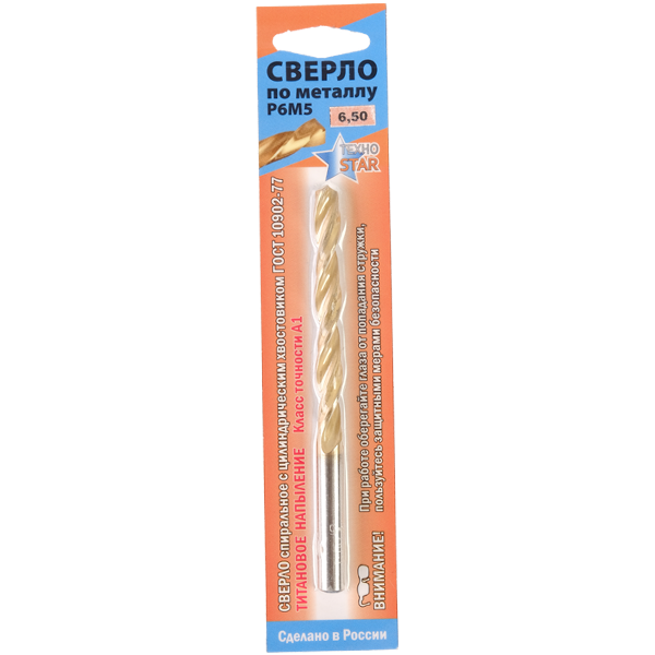 Сверло по металлу 6,50мм цил.хв. титан. ГОСТ10902А1 Р6М5-ШБ Скин-упак.